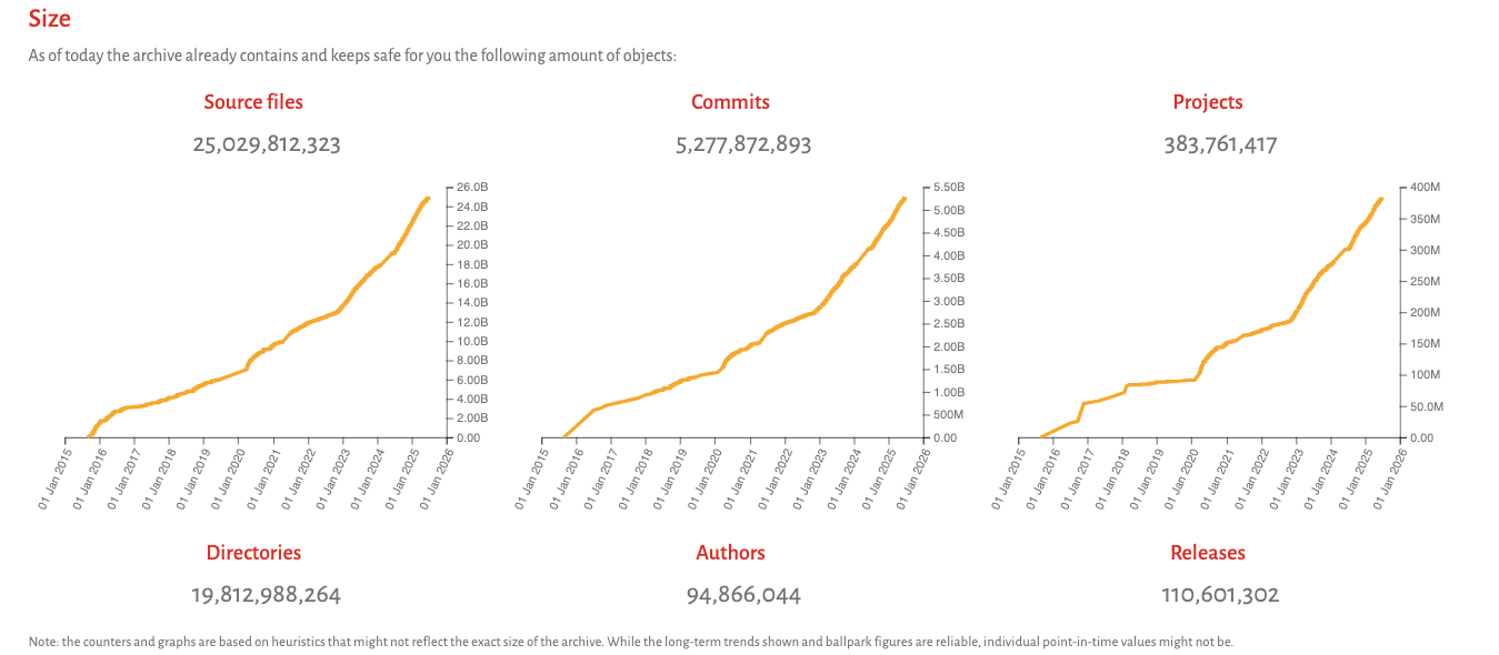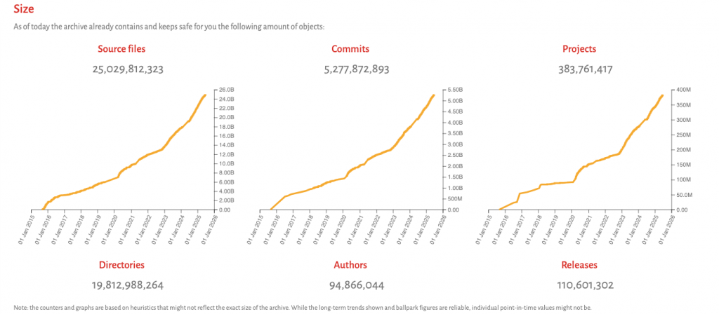 The scale is staggering: it holds almost 400 million projects, over 25 billion unique source code files, and more than five billion unique commits. Software Heritage tirelessly crawls more than 5,000 different code hosting and distribution platforms every single day.