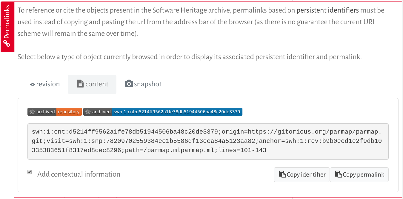 You can also get the full SWHID for any archived software artifact directly from the Software Heritage Archive: using the red vertical tab called “Permalinks”, present on every page that shows source code (see this HOWTO for details). The advantage of this second approach is that you can get a SWHID with relevant contextual information (e.g. the position of your artefact in the global graph of software development).
