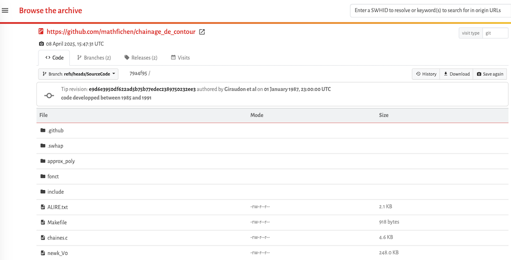 The preserved source code can be found on Software Heritage archive: https://archive.softwareheritage.org/browse/origin/directory/?origin_url=https://github.com/mathfichen/chainage_de_contour