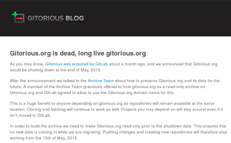 In May 2015, Gitorious also announced that its free software development hosting services would be discontinued. Thanks to the effort of the Archive Team, a read-only copy of the software projects originally developed on Gitorious will be maintained. But for how long?