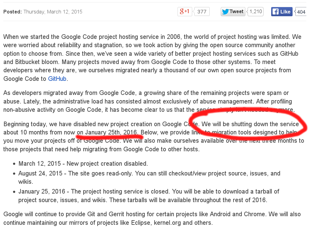 In March 2015, Google announced the demise of the widely used, and greatly appreciated Google code service, that was used for years since its launch in 2006.