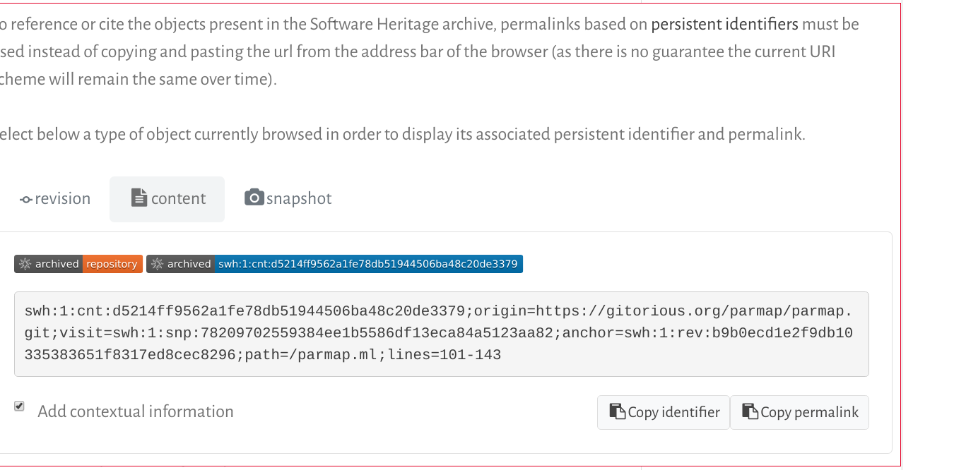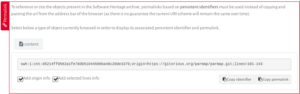 SWH-IDs as supported by Software Heritage allow you to go even further and pinpoint a given fragment of code inside a specific version of a file, by using the lines= qualifier available for identifiers that point to files.